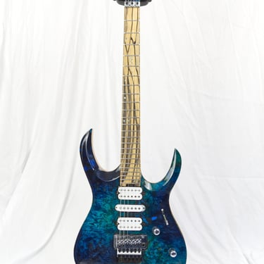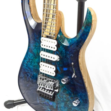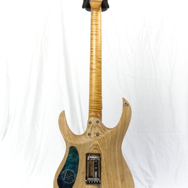 COMMISSIONED || BODY: Curly Ash, TOP: 1-Piece Curly Poplar, NECK: Curly Maple, FRETBOARD: Ebony, Stainless steel Jumbo fret, SCALE: 25.5", RADIUS: 16", BRIDGE: Hipshot, TUNERS: Hipshot Locking; PICKUPS: Bare Knuckle Juggernaut Set, 1 Volume, 5-Way Super Switch,