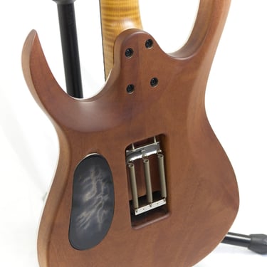 COMMISSIONED || BODY: Mahogany, TOP: 1-piece Curly Poplar, NECK: Rosted Curly Maple, FRETBOARD: Ziricote, Stainless steel Jumbo fret, SCALE: 25.5", RADIUS: 14", BRIDGE: Schaller Lockmeister, TUNERS: Schaller; PICKUPS: Bare Knuckle Rebell Yell Set, 1 Volume,